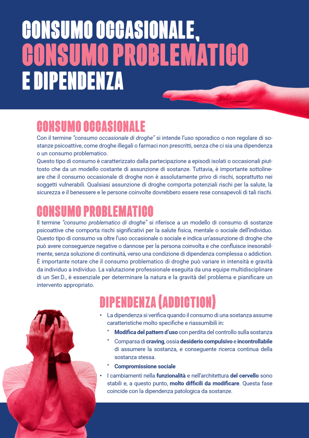 Si elencano inoltre una lista di comportamenti che potrebbero identificare una persona con dipendenza da sostanze.